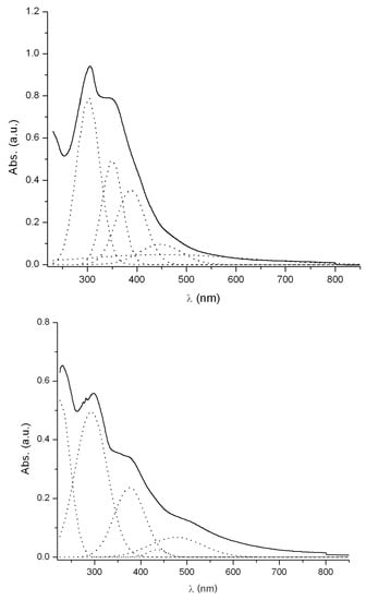The UV-Vis spectra of the five-coordinate Schiff-base complexes 3 and 5 were recorded in CH2Cl2 (εr = 8.90) and in DMSO (εr = 47.6). The deconvoluted spectral data are gathered in Table 3, whereas both experimental and deconvoluted spectra are displayed in Figure 3 (for those recorded in CH2Cl2) and Figure S3 (for those recorded in DMSO). A strong broad absorption band was observed in the 300–430 nm range, whereas a set of two to three absorption bands appeared in the 450–650 nm range. The high-energy bands are attributed to π–π* intra-ligand charge-transfer transitions (ILCT), and the lower-energy bands are assumed to involve ligand-to-metal and metal-to-ligand charge-transfer transitions in a lesser extent [27]. In the spectrum of 5 recorded in DMSO (Figure S3), the band at 502 nm could be indicative of high-spin species, while the lowest energy band observed around 650 nm could arise from d–d transitions [22].