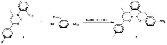The acceptor unsymmetrically substituted Schiff base 2 was synthesized by the classical condensation reaction between half-unit (4-F–C6H4)–C(O)CH=C(CH3)–N(H)–C6H4–NH2 (1) [29] and 5-nitrosalicylaldehyde, in methanol at room temperature for 6 h (Scheme 1). Compound 2 was isolated as an air- and thermally stable yellow solid in good yield (79.7%). This proligand is soluble in the common organic solvents except diethyl ether and hydrocarbons.
