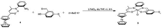 All manipulations were performed under dry nitrogen atmosphere using standard Schlenk techniques. Solvents were dried and distilled according to standard procedures [53]. 5-nitrosalicylaldehyde, 5-methoxy-2-hydroxybenzaldehyde, iron (III) chloride and potassium tert-butoxide were purchased from Aldrich (Sigma-Aldrich Co., St. Louis, MO, USA) and used without further purification. Half units (4-F–C6H4)–C(O)CH=C(CH3)N(H)-o-C6H4NH2 (1) [29] and {(η5-C5H5)Fe(η5-C5H4)–C(O)CH=C(CH3)N(H)-o-C6H4NH2 (4) [33] were synthesized according to published procedures, characterized by FT-IR and 1H-NMR spectroscopy and checked against literature data.