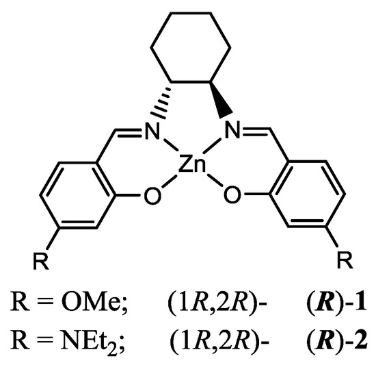- Oliveri, I.P.; Forte, G.; Consiglio, G.; Failla, S.; Di Bella, S. Aggregates of defined stereochemical scaffolds: A study in solution of a zinc(II) Schiff base complex derived from the enantiopure trans-1,2-cyclopentanediamine. Inorg. Chem. 2017, 56, 14206–14213. [Google Scholar] [CrossRef] [PubMed]