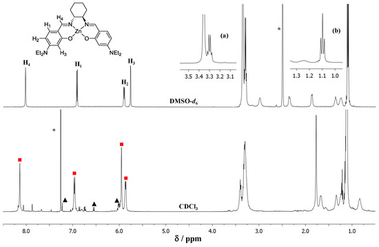 1H NMR spectra of (R)-2 (1.0 × 10−2 M) in DMSO-d6 and CDCl3. Asterisks indicate residual solvent peaks. The labeling of the 1H NMR signals related to the CDCl3 solution refers to species (R)-2A (denoted by the red squares) and (R)-2F (denoted by the black triangles). Inset: (a) expansion of the N-CH2-CH3 signal and (b) of the N-CH2-CH3 signal of (R)-2 in DMSO-d6.