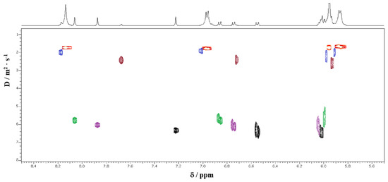 1H NMR DOSY spectrum of (R)-2 in CDCl3 (1.0 × 10−2 M; 27 °C). Species 2A–F are shown with a different color.