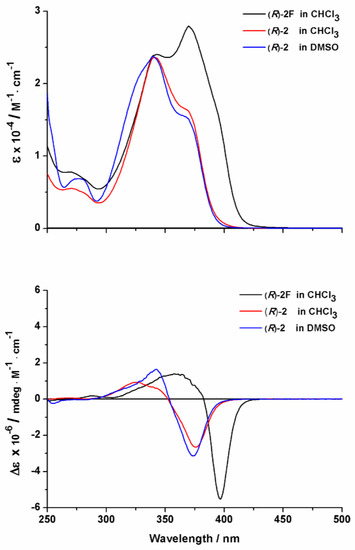 The differences observed in optical absorption spectra are reflected in circular dichroism (CD) spectra (Figure 4). Thus, while a comparable bisignate signal is observed for solutions of (R)-2 in DMSO and CHCl3, in contrast a stronger and redshifted bisignate signal is noticed for (R)-2F.