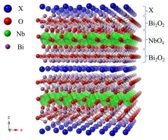 - Kusainova, A.M.; Zhou, W.; Irvine, J.T.; Lightfoot, P. Layered Intergrowth Phases Bi4MO8X (X = Cl, M = Ta and X = Br, M = Ta or Nb): Structural and Electrophysical Characterization. J. Solid State Chem. 2002, 166, 148–157. [Google Scholar] [CrossRef]