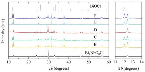 Powder X-ray diffraction (XRD) of the products obtained from different conditions (B–F) listed in Table 1. The top and bottom XRD data represent BiOCl [15] and Bi4NbO8Cl [16], respectively simulated from the ICSD database. The right panel is enlarged view of 2θ = 11–14°. 2θ = 12.0° belongs to the 001 reflection of BiOCl and 2θ = 12.3° is the 004 reflection of Bi4NbO8Cl.