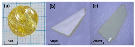 (a) The obtained crystalline mass; (b) A 120 × 80 × 20 μm3 crystal stripped from crystalline mass; (c) A 340 × 210 × 40 μm3 crystal consisting of two domains superimposed along the c axis.
