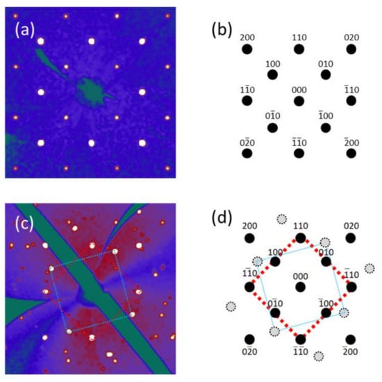 Unless otherwise specified, we hereafter characterize the Bi4NbO8Cl crystals obtained in the optimized condition (Condition D). The energy-dispersive X-ray spectroscopy (EDX) spectra of a single crystal (based on inspection of 12 points) show an average elemental distribution of Bi:Nb:Cl = 0.26:0.06:0.06 (Figure S3a), in accordance with the nominal molar ratio of 4:1:1 for Bi4NbO8Cl. A single-crystal XRD measurement was conducted for a platelet crystal of approx. 120 × 80 × 20 μm3 (Figure 3b). All the in-plane (ab plane) spots can be indexed as shown in Figure 4a,b. The refinement in the space group P21cn provided the lattice parameters of a = 5.4835(3) Å, b = 5.4850(3) Å, c = 28.682(2) Å, along with R1 = 0.0374, wR2 = 0.1000. The atomic positions and isotropic thermal parameters for Bi4NbO8Cl are listed in Table S1 while the interatomic distances and angles are given in Table S2.