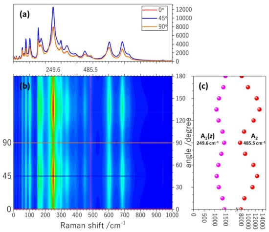 (a) Raman spectra in parallel nicol geometries obtained in a spectral range from 0 to 1000 cm−1; (b) Contour plots of angular dependences of the polarized Raman intensity; (c) Angular dependence of the integrated Raman intensities of the modes at 249.6 cm−1 and 485.5 cm−1 indicated by vertical red and pink lines in (c). These modes are assigned to be A1(z) and A2 modes respectively.