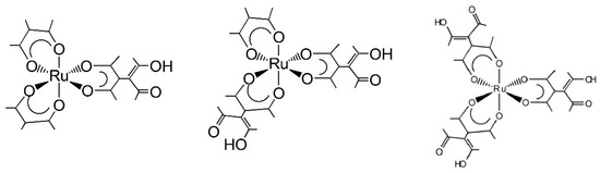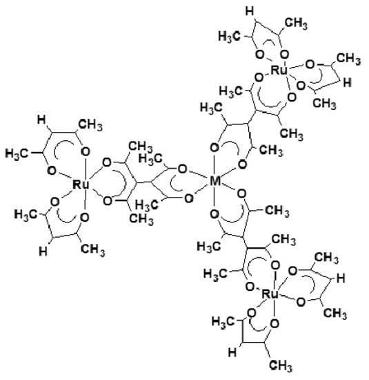 One approach taken in this area is so-called molecular tectonics []. According to the method, one-, two-, or three-handed units (or tectons) are connected to construct molecular frameworks systematically []. When chirality is introduced into each tecton, the organized systems might exhibit various levels of chirality from molecular to macromolecular scales. We have employed the ∆Λ isomerism of a tris(chelated) complex as a chiral motif with D3 symmetry in the tectonics approach []. A mononuclear complex with empty coordinating sites is possible to play a role of a tecton. On this basis, tris(acetylacetonato)ruthenium(III) ([Ru(III)(acac)3]) was reacted with tetra acetylethane (taetH2) in solid states. It lead to the production of mixed ligand complexes such as [Ru(acac)n(taetH)3−n] (acac = acetylacetonato; taetH = singly protonated tetraacetylethanato; n = 2, 1 and 3, respectively). They were expected to play roles of one-, two-, and three-handed chiral tectons, respectively (Chart 1). Various types of multi-nuclear complexes were prepared by connecting these tectons with an inert or labile metal ion such as Al(III), Fe(III), Ni(II), Ru(III), and Pd(II) [,,,,]. As a result of using chiral tectons, the resultant systems exhibited supramolecular chirality.