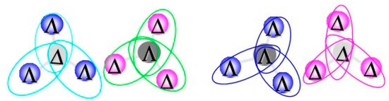 We have previously reported the VCD spectra of eight inert diastereomers of ∆- (or Λ-)[{∆-(or Λ-)Ru(III)(acac)2(taet)}3Ru(III)] []. In analyzing the spectra, an attention was paid to the band around 1550 cm−1, which was assigned to the stretching modes of two C–O bonds in a β-diketonato ring. It was deduced that the sign of the VCD peak reflected the chiral character of the vibrational motion localized on the C–O bonds. Particularly the spectral features of the peaks depended on whether the part connecting the central core and anyone of three peripheral moieties was ∆–∆ (or Λ–Λ homo-chiral connection) or ∆–Λ (or Λ–∆ hetero-chiral connection). Peripheral parts were called the homo- and hetero-chiral connections (Chart 3), respectively. In the present star-burst complexes of [{∆-Ru(acac)2(taet)}3 Λ-Al] and [{Λ-Ru(acac)2(taet)}3 ∆-Al], the number of homo- and hetero chiral connections are 0 and 3, respectively. The signs of the VCD spectra observed around 1300 cm−1 (No. 4 in Figure 4a) were in accord with the hetero-chiral connections of ∆- (or Λ-)[{∆-(or Λ-)Ru(III)(acac)2(taet)}3Ru(III)] []. In other words, the central labile core around an Al(III) atom was revealed to be locked in the antipodal chirality (Chart 3 (left)). Such a locking was achieved due to the molecular stacking in a solid state.