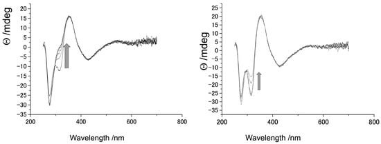 The time change of the electronic circular dichroism (ECD) spectrum of a chloroform solution of [{Λ-Ru(III)(acac)2(taet)}3Al(III)] at monitoring wavelength of 318.8 nm. The temperature was 5, 10, 15, 20, 25, 30, and 35 °C from the top to the bottom.