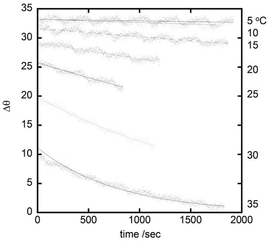 Comparing the ECD spectra between 0 °C and room temperature, the rate of epimerization depended on the temperature remarkably. The time-change of the ECD spectrum was monitored in the temperature range from −10 °C to 35 °C. The monitoring wavelength was 318.8 nm as selected from the results of Figure 1. The effects of medium were studied using CH3OH and CH3Cl as a solvent. The examples were shown in Figure 2 in case of [{Λ-Ru(III)(acac)2(taet)}3Al(III)] in CHCl3. The rate constant was calculated by fitting the experimental curves according to the following Equation (1):