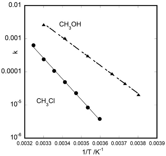 Figure 3 shows the Arrhenius plots of the unimolecular rate constants in CH3Cl and CH3OH. From the slope of each plot, the activation energy of epimerization was obtained to be ca. 120 kJ/mol and 81 kJ/mol in CHCl3 and CH3OH, respectively. The results indicated that energy barrier for epimerization was higher for a less solvating solvent (CH3Cl) than for more solvating one (CH3OH).