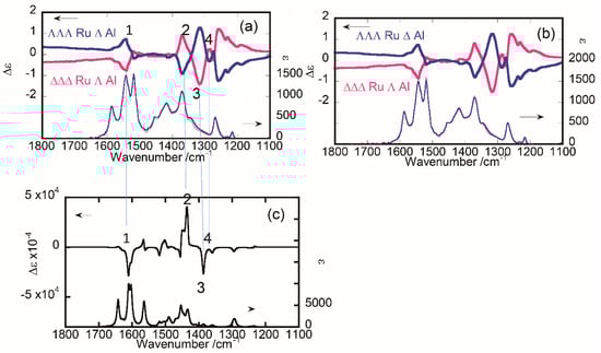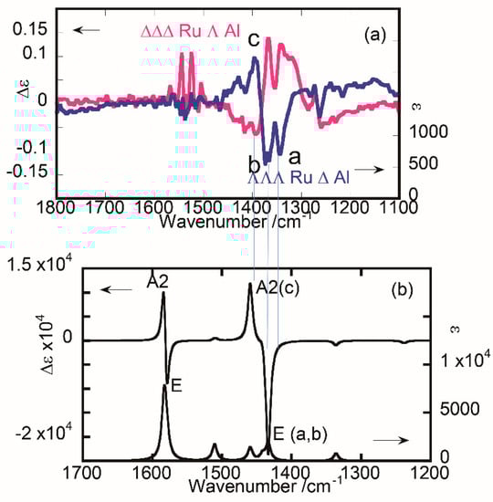 The VCD spectra varied with time. The difference between the initial (ca. 10 min) and final (ca. 1.5 h) spectra was calculated as shown in Figure 5a. The signal-to-noise ratio for main peaks in the difference spectra was of the order of 10 so that the peaks were regarded as true ones with sufficient reliability. Each peak was numbered in order to make correspondence between the experimental and theoretical spectra. For comparison, the VCD and IR spectra of ∆- and Λ-[Al(III)(acac)3] were calculated as shown in Figure 5b. The couplet peaks around 1300~1400 cm−1 peaks are assigned to the stretching vibrations of C–C–C and C=O in the bridging parts between the peripheral and central core regions. When a tris(chelated) complex maintains the D3 symmetry, no splitting occurs for the peaks as assigned to degenerated E-state. Experimentally, however, the peaks were split into two (a and b). It implied that the D3 symmetry was broken in the present tetranuclear complex. The signs of the couplet peaks were well coincident between the experimental and calculated spectra. This leads to the conclusion that the absolute configuration of the central core in [∆- or Λ-Ru(III)(acac)2(taet)}3Al(III)] was Λ or ∆, respectively. It was in accord with the conclusion from the ECD spectra. In other words, the peripheral Ru(III) moieties tended to lock the configuration of the central labile core in the antipodal manners.