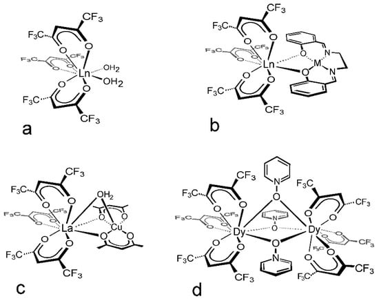 The hexafluoroacetylacetonate (hfac) complexes of the trivalent lanthanide ions are ubiquitous starting materials. While the homoleptic neutral entities Ln(hfac)3 are unknown in the condensed phase, many neutral heteroleptic complexes Ln(hfac)3Ln with lanthanide coordination numbers ranging from 7 to 10 [21,22,23,24] have been structurally characterized. Among these, eightfold coordination dominates as exemplified by the aquo-complexes Ln(hfac)3(H2O)2 [25] (cf. Figure 1a). Indeed, the Lewis acidic fragment Ln(hfac)3 has been employed as a building block for several structures by ligation of bidentate transition metal complexes creating heterometallic bi- and polynuclear systems in a systematic fashion [26,27] where one simple system is illustrated in Figure 1b [28]. However, to date, only a single example of a triply bridged system based on the Ln(hfac)3 fragment, namely CuLa(μ2-acac-O,O,O′)2(μ-H2O) (hfac)3 (acac = acetylacetonate), entailing nine-coordination of the large La3+ ion, has been reported (cf. Figure 1c) [29].