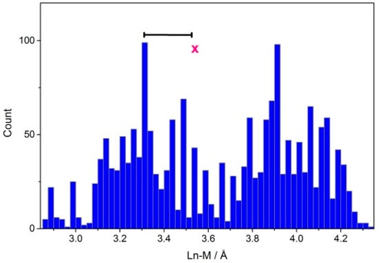 Distribution of lanthanide–transition metal distances for structurally characterized, triply bridged polynuclear systems. The bar indicates the range for the present La, Pr, and Gd systems. The cross indicates the average value for all triply bridged La–transition metal structures. The data are based on entries in CSD ver. 5.39.