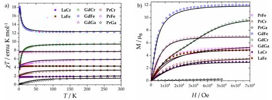 The magnetic properties of all these compounds were investigated using dc and ac magnetometry. In Figure 5a, we report the χT product of all the investigated derivatives. The room temperature values of all the samples are consistent with the expected Curie constants for independent paramagnetic ions: LaCr: 2.04 (1.88); LaFe: 4.33 (4.38); GdCr: 9.55 (9.76); GdFe: 12.27 (12.26); GdGa: 7.76 (7.88); PrCr: 3.40 (3.48); PrFe: 5.89 (5.98); and PrGa: 1.69 (1.60). The χT product of LaFe, LaCr, and GdGa exhibits a small decrease on lowering temperature due to the relatively small magnetic anisotropy of both the trivalent transition metal ions and of the half-filled Gd3+ ion (cf. Supplementary Materials Figures S3 and S4). This allows a simple qualitative evaluation of the nature of the coupling that instead dominates the shape of the χT curves of the GdM (M = Ga, Fe, or Cr) derivatives: ferromagnetic (FM) in GdFe and antiferromagnetic (AFM) in GdCr. The nature of the coupling is more difficult to extract at a glance for the complexes containing Pr3+ due to its pronounced magnetic anisotropy. However, the low-temperature value of the χT product of PrGa (Figure 5a) goes to zero when the temperature is decreased, and the magnetization curves (Figure S5a) almost coincide at all temperatures, suggesting that the effect of the ligands is to stabilize the diamagnetic mJ = 0 ground state of Pr3+. No hysteresis was observed in any of the samples at the lowest accessible temperature (1.8 K).
