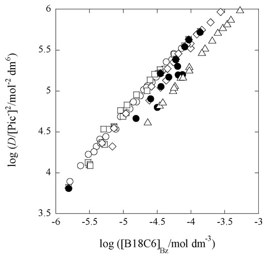 Experimentally-obtained slopes were 0.98 for the Pb(II)–B18C6 extraction system with 0 mmol·dm−3 of Cd(II) (or [Cd]t/[Pb]t = 0), 1.0 for that with 0.58 of Cd(II) (or 1.06), 0.97 for that with 14 of Cd(II) (or 26.6), 0.98 for that with 48 of Cd(II) (or 88.4), and 1.0 for that with 97 of Cd(II) (or 178). From these results, we can see easily that the compositions of Pb(II):B18C6 are 1:1 for all the systems. In the present study, there was no need of employing Equation (2a). The compositions of Pb(II):Pic(−I) were speculated to be 1:2 from similarity to the systems [3] reported before for M(II) extraction with 18C6 into Bz and from a charge balance in the Bz phases [1,8,19,21]: approximately [PbLPic+]Bz ≈ [Pic−]Bz from more-precisely 2[Pb2+]Bz + 2[PbL2+]Bz + [PbLPic+]Bz + [PbPic+]Bz ≈ [Pic−]Bz + [NO3−]Bz, because it was expected that [PbLPic+]Bz >> 2[Pb2+]Bz + 2[PbL2+]Bz + [PbPic+]Bz and [Pic−]Bz >> [NO3−]Bz [9,21].