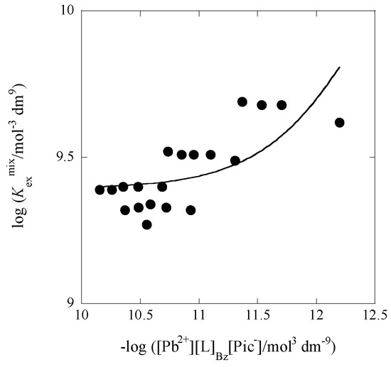 Since significant amounts of Cd(II) in the Bz phases were not detected with the AAS measurements, the following extraction model was employed for the analysis of the present system: (1) Pb2+ + L ⇌ PbL2+ [29] (KCdL = 0.89 mol−1·dm3 [18] was omitted; (2) Pb2+ + Pic− ⇌ PbPic+ [21]; (3) Cd2+ + Pic−⇌ CdPic+ [1]; and (4) H+ + Pic− ⇌ HPic [33] in the water phase; (5) Pic− ⇌ Pic−Bz; (6) HPic ⇌ HPicBz [36]; (7) L ⇌ LBz [2]; and (8) PbL2+ ⇌ PbL2+Bz between the water and Bz phases; and (9) PbL2+Bz + Pic−Bz ⇌ PbLPic+Bz; and (10) PbLPic+Bz + Pic−Bz ⇌ PbLPic2,Bz in the Bz phase. Except for the Processes (5), (8)–(10), the equilibrium constants of the above processes at 298 K were available from References [1,2,18,21,29,36,37]. Analytic method of the extraction system based on this model was essentially the same as that reported before [1,9] (see Section 2.2).
