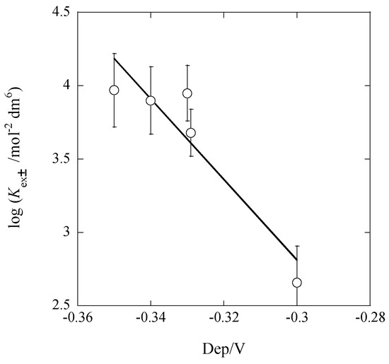 From the regression analysis of an experimental plot in Figure 4, the following line was obtained: log Kex± = (−5.3 ± 1.4) − (27.3 ± 4.2)Δφeq at |R| = 0.967, where the symbol R denotes a correlation coefficient. This regression line is close to Equation (11a) which was estimated from the experimental K values. This fact indicates the presence of dep, as similar to the results reported previously [7,8,12,16,21,22].