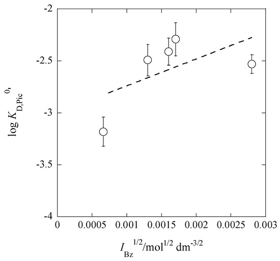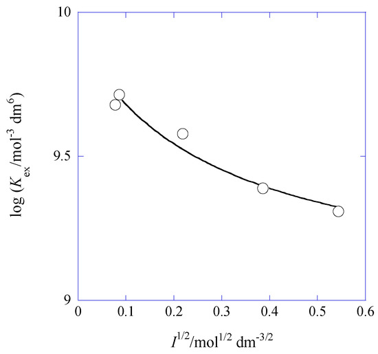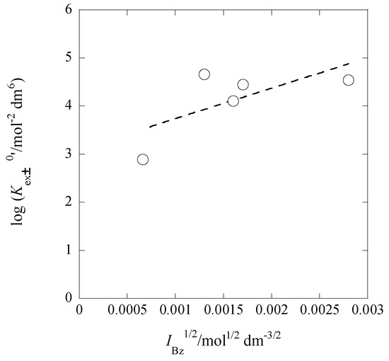 Figure 8 shows the plot of log Kex±0′ versus IBz1/2 based on Equation (16). The regression analysis of this plot gave the equation of log Kex±0′ = (3.11 ± 0.69) + 2 × (315 ± 196) at R = 0.680. From this Kex,±0 value and the Kex0 one, we calculated log K2,Bz0 to be 6.80 ± 0.69, being in good agreement with that (=6.8) evaluated from Equation (15a).