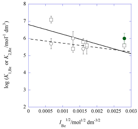 In comparison of Equations (14a) and (15a) with Equations (14b) and (15b), the point of intersection changed from IBz1/2/mol1/2·dm−3/2 = 0.0027 to 0.0033, while their corresponding log K1,Bz (=log K2,Bz) value changed from 5.3 to 6.3.