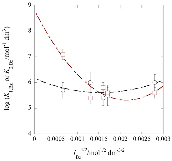 with the approximation of 1 >> (see Table 2). Here, the symbols b1 and b2 denote empirical curve-fitting parameters [30,31] which were simply predicted in this study from the plot shapes (see Figure 6). The regression analyses of the plots at 298 K gave log K1,Bz = (6.16 ± 0.80) − 4 × (179 ± 247) + (2.3 ± 2.7) × 105IBz at R = 0.569 and log K2,Bz = (8.80 ± 0.98) − 2 × (1625 ± 603) + (7.6 ± 3.3) × 105IBz at 0.914 (see Figure 7). Modifying these equations like the Davies one [30,31], their 2nd and 3rd terms became −4 × (179 ± 247)( − (3.2 ± 5.9) × 102IBz) and −2 × (1625 ± 603)( − (2.3 ± 1.3) × 102IBz), respectively. These b1/4ABz and b2/2ABz values of about 320 and 230 mol−1/2·dm3/2 for the Bz phases are much larger than 0.3 [31] for the aqueous solution at 298 K. Equation (14b) intersects Equation (15b) around IBz1/2 = 3.3 × 10−3 mol1/2·dm−3/2, yielding log K1,Bz = log K2,Bz = 6.30, and then their two lines equal with each other within the experimental errors (see the plots in Figure 7).