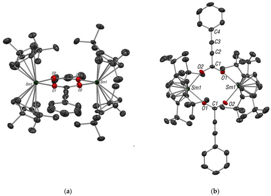 Since the Sm–C bond is likely to be highly polarized, we reasoned that an insertion would be favored and investigated the opportunity with CO2. Thus, the reaction of 1 with 1 atmosphere of CO2 was performed in deuterated toluene. No color evolution was observed but after 12 h of reaction, the yellow solution was cooled at −35 °C and yellow X-ray suitable crystals were obtained. The structure revealed a dimeric structure, in which the CO2 is inserted in the Sm–alkene bond yielding an organic carboxylate Ph–C≡C–CO2− species that bridged two samarocene fragments (Figure 2). A planar eight-membered ring structure is obtained and is similar to other reported lanthanides–carboxylates complexes [Cp*2Sm(O2C6H4Me-m)]2 and [(Cp*2Sm(O2CCH2Ph)]2 [24]. Evans complexes were obtained from a different synthetic pathway than complex 2. The complexes were synthesized from Cp*2Sm(thf)2 and m-toluic acid or phenylacetic acid to form [Cp*2Sm(O2C6H4Me-m)]2 and [(Cp*2Sm(O2CCH2Ph)]2. Those two complexes have been prepared to identify the several products obtained from the reaction between [Cp*2Sm][(µ-Ph)2BPh2]/LiMe/toluene and CO2 [24].