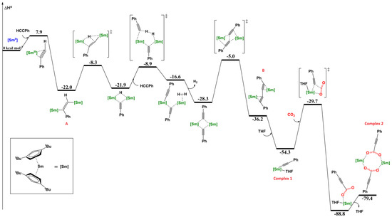 Energy profile of CO2 insertion pathway for the complex Cptt2Sm(C≡C–Ph)(thf) (1).