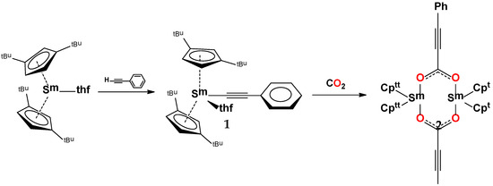 All reactions were performed using standard Schlenk-line techniques or in an argon-filled glovebox (MBraun, Garching, Germany). All glassware has been dried at 120 °C for at least 12 h prior to use. KCptt and Cptt2Sm(thf) were prepared according to published procedures [20]. Toluene and toluene-d8 were dried over sodium and transferred under reduced pressure in a cold flask and all solvents were degassed prior to use. Phenylacetylene was purchased from Sigma-Aldrich (Merck KGaA, Darmstadt, Germany) and purified prior to use. CO2 was purchased from Air liquid (Air liquid, Paris, France) as Alphagaz N48.