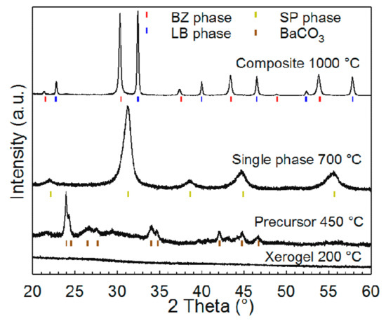 X-ray diffraction (XRD) patterns of the 3M10Y material at room temperature after each thermal step are displayed in Figure 1 and these patterns are representative for all the compositions. The xerogels remained amorphous while the precursors calcined at 450 °C showed BaCO3 reflections. A perovskite with Pm − 3m cubic structure was obtained by annealing the precursor at 700 °C in N2 atmosphere. The corresponding diffraction patterns of all the materials in the 3M family after annealing at 700 °C in N2 are presented in Figure 2. Three of the materials are single phase, while the high Y-content materials (3M15Y and 3M20Y) contained a minor amount of BaCO3 at this stage. All of the 3M family materials were further processed in the same manner, except the exsolution temperature, which varied between 900 and 1000 °C. The minor amount of BaCO3 in the 3M15Y and 3M20Y compositions decomposed completely during the exsolution of the precursor phase into the composite (Figure 3). The 3M and 3M5Y composites were exsolved to two-phase composites in air at 900 °C. The 3M10Y, 3M15Y, and 3M20Y were found to have additional secondary phases when exsolving at 900 °C and 950 °C. Hence, these high Y-content materials were therefore exsolved at 1000 °C in order to obtain the desired terminal two-phase composites.