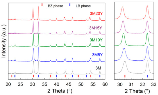 XRD patterns at room temperature of the composites with nominal composition of 0.6 La0.5Ba0.5Co1/3Mn1/3Fe1/3O3−δ-0.4 BaZr1−zYzO3−δ formed at 900 °C for 3M and 3M5Y and 1000 °C for 3M10Y, 3M15Y, and 3M20Y. BZ and LB stand for barium zirconate-based phase BaZr1−zYzO3−δ and lanthanum metal oxide-based phase La0.5Ba0.5Co1/3Mn1/3Fe1/3O3−δ, respectively.