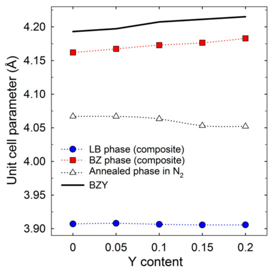 Cubic unit cell parameters at room temperature of the precursor annealed phase (open triangles) and the composite phases (blue and red) obtained by Rietveld refinement. Lines are a guide for the eye. A black line for a yttrium-doped barium zirconate (BZY) cell parameter from the literature is included for comparison [33].
