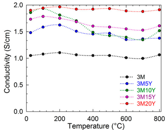 The porosity-corrected direct current (DC) conductivity of the composites is plotted in Figure 6. All 3M composites show conductivities above 1 S/cm, with minor temperature dependence. The value of the electrical conductivity increases with the nominal Y-content. The Y-free 3M composite has the lowest electrical conductivity while the 3M20Y composite has the highest for all temperatures with a maximum of 1.96 S/cm at 200 °C.