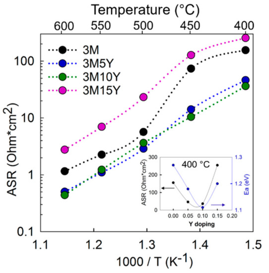 Total area specific resistance (ASR) of 3M, 3M5Y, 3M10Y, and 3M15Y composite cathodes in symmetric cell configuration in 3% moist synthetic air as a function of temperature. Inset shows the relationship of the ASR at 400 °C and Ea with respect to the Y content. Lines are a guide for the eye.