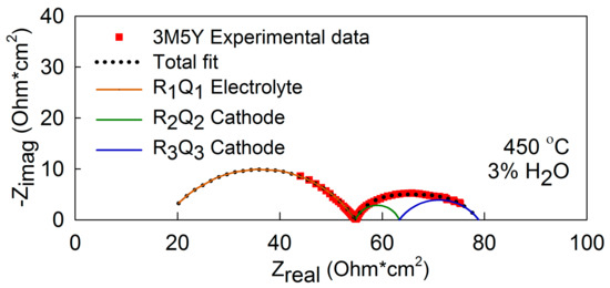 Symmetric cell electrochemical performance (quantified by total area specific resistance, ASR) of the various cathode composites in 3% moist synthetic air is provided in Figure 7. The data for 3M20Y is not included due to the high resistance obtained. A Nyquist plot of the 3M5Y impedance response and the fitted equivalent circuit at 450 °C in 3% moist synthetic air is presented in Figure 8. The experimental data fitted to the Rs(R1Q1)(R2Q2)(R3Q3) equivalent circuit were assigned on the basis of their pseudocapacitances as follows. R1 is assigned to the electrolyte grain boundary response (C1 ~9 × 10−10 F/cm2), while R2 and R3 are assigned to the electrode response with C2 ~10−2 F/cm2 and C3 ~10−1 F/cm2. The cathode ASR values are the sum of R2 and R3, as these two resistances are assigned to the electrode response, multiplied by the area and divided by 2. The 3M5Y and 3M10Y cathodes show the best performance (lowest ASR). The total ASR at 600 °C is 0.44 Ω·cm2 for 3M10Y and 0.50 Ω·cm2 for 3M5Y. At 400 °C, the ASR values for these two cathodes are 36.22 Ω·cm2 and 46.12 Ω·cm2, respectively. The inset in Figure 7 displays the ASR values and the activation energy as a function of the Y content at 400 °C. Y doping up to 10 mol % appears to improve the cathode performance, while higher Y-doping levels led to a decrease in performance.