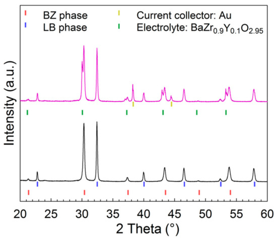 XRD patterns of the 3M10Y composite with nominal composition of 0.6 La0.5Ba0.5Co1/3Mn1/3Fe1/3O3−δ-0.4 BaZr0.9Y0.1O2.95. The black pattern represents the composite powder formed at 1000 °C and the purple pattern represents the cathode deposited on the BaZr0.9Y0.1O2.95 electrolyte after EIS characterization. Gold current collector reflections can be seen in the symmetric cell diffractogram.