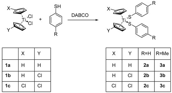 Treatment of the known titanocene dichlorides (C5H4X)(C5H4Y)TiCl2 (X = Y = H, 1a; X = H, Y = Cl, 1b; X = Y = Cl, 1c) [33,34] with HS–C6H4R (R = H, p-Me) in the presence of DABCO (1,4-diazabicyclo[2.2.2]octane) yields the corresponding titanocene arylthiolates (C5H4X)(C5H4Y)Ti(S–C6H4R)2 (R = H, 2a–c, Me: 3a–c), respectively, in good yields (64% to 89% except for 3b, 19%) (Scheme 1).