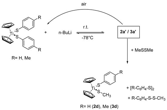 Such a redox equilibria are known from electrochemical studies of Cp2TiCl2 [41,42]. It was found that dependent on the cyclopentadienyl ring substituents, the intermediate radical anion might either reversibly split off a chloride anion yielding Cp2TiCl (the so-called “Nugent-Rajanbabu-reagent” [43]) or irreversibly one of the cyclopentadienyl ligands to give CpTiCl2. It was also reported that treatment of the dialkyltitanocenes Cp2TiR2 with organolithium compounds first produced unstable “back-onium complexes” [Cp2TiR3]−Li+, which decomposed at 20 °C to CpTiR2, RH, and LiCp [23]. At least in the observed time and temperature frame used by us, the presumed Ti(III) thiolates 2a′/3a′ are more stable since we could not observe any LiSAr or LiCp in the reaction solution. Quite interestingly, when a fourfold excess of butyl lithium was used in an NMR experiment, LiCp can be detected in the cold solution, but it disappears when warming-up. At the same time, Tol-SBu can be detected. Therefore, the first reactions in this case are outlined below.