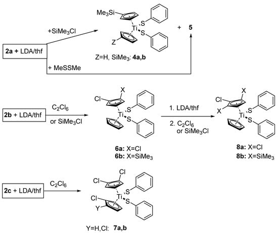 A zirconium compound of an identical structure (5, M = Zr) was obtained by an oxidation reaction of a Zr(II) complex and characterized by NMR spectra and crystal structure determination [44]. Similar fulvalene-bridged Ti(III) complexes with chloride, hydride, or sulfide bridges instead of the aryl thiolate bridges were obtained by a sodium reduction of Cp2TiCl2 [45] or thermolysis of the Ti(II) complex Cp2Ti(Me3Si–C≡C–SiMe3) [46]. A related mono-cyclopentadienyl Ti(III) complex without a fulvalene bridge known as [CpTiCl]2[µ-SAr]2 was obtained from the corresponding mononuclear CpTiCl2(SAr) upon a reduction with sodium amalgam [47]. We assume that the ring-lithiated primary product of the 2a-LDA reaction is unstable under the reaction conditions and decomposes after splitting off LiSPh first to a Ti(III) radical centered on the Cp ring, which dimerizes to form the finally observed dinuclear compound 5.
