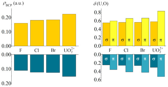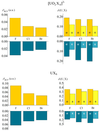 Figure 3 summarizes QTAIM metrics for equatorial U-X bonds in [UO2X4]2− and UX6 complexes (see Supplementary Materials for numerical data). This data was obtained by taking a U–X bond to define the principal molecular axis and reference to σ-contributions and π-contributions to bonding is given in this study with respect to the U–X bond. This approach is taken throughout this contribution.