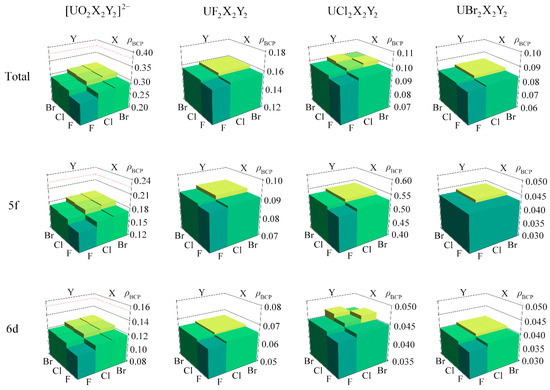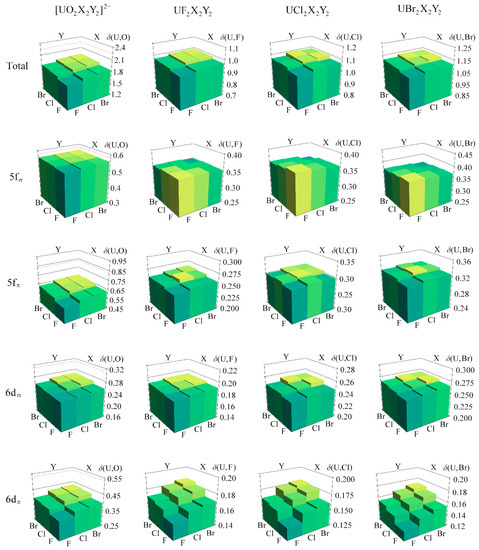 Figure 4 summarizes calculated values of the axial bond (numerical values are presented in the Supplementary Materials). Focusing initially on the uranyl halides, the characteristics identified in Section 2.2 are maintained, i.e., that equatorial ligand sets including the lighter, more electronegative halides perturb the axial U–O bond more with the 5f and 6d contributions being approximately equally affected. The effect of altering the equatorial ligand set in the uranium halides is less pronounced, presumably due to the more ionic nature of the interactions. attains a maximum value 0.160 a.u. for the U–F bond with an equatorial ligand set comprised of Cl and/or Br. This is, however, just 3% larger than the value found in UF6. Broadly speaking, there is a modest perturbation to when the equatorial ligand set includes F while calculated metrics are almost completely insensitive to replacing Cl by Br.