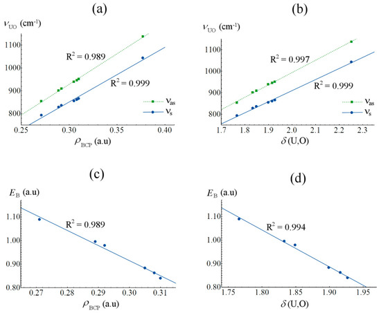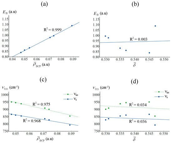 Figure 6 reports correlations between QTAIM parameters of the UO bond, U–O stretching vibrational frequencies (), and the binding energy () of the equatorial ligand set (see Supplementary Materials for numerical data). Extremely strong correlations are found between vibrational frequencies and both and (Figure 6a and Figure 6b, respectively), which indicates that the covalency of the U–O bond is strongly stabilizing. We have previously reported similar strong correlations with a more varied ligand set [75]. Perhaps more interestingly, strong anti-correlations are also found between these topological parameters and binding energies, which is defined in Equation (3). These anti-correlations (Figure 6c,d) illustrate the perturbation of the U-O bond covalency by the presence of the equatorial ligands, which suggests that U-O bond vibrations can be used as a quantitative probe of equatorial ligand stability.
