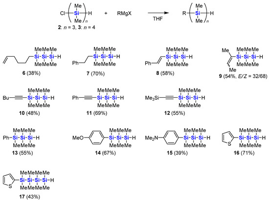 In the cases of polymethylated oligosilanes 2 and 3, Grignard reagents are more suitable for the substitution of the chlorosilane moiety. The Grignard reagents were prepared in the presence of lithium chloride and DIBAL-H to activate magnesium metal [45]. As shown in Scheme 3, various alkyl, alkenyl, alkynyl and aryl groups were introduced, and substituted hydrooligosilanes were successfully synthesized. As alkyl group installation, 5-hexenyl- and 2-phenylethylmagnesium reagents were used to afford hydrotrisilanes 6 and 7. Mono- and disubstituted alkenyl groups such as styryl and 2-buten-2-yl ones were also introduced to the trisilane skeleton successfully. The stereochemistry of the alkene moieties of trisilanes 8 and 9 was determined by 1H NMR spectroscopy. The E geometry of the styryl group in 8 was confirmed by the J value of the vinylic coupling (19 Hz). The major Z isomer of 9 was confirmed by NOE experiment. Three types of alkynyl Grignard reagents with aliphatic, aryl and silyl substituents were subjected to the reaction to afford alkynyltrisilanes 10–12. Various aryl groups were also introduced to 2 to afford phenyl-, 4-methoxyphenyl-, 4-dimethylaminophenyl-, and 2-thienyltrisilanes 13–16. The similar arylation was also applicable to 3, and 2-thienyltetrasilane 17 was obtained. All of these reactions proceed without loss of the hydrosilane moieties, which can be used for further modification of the hydrooligosilanes. The reason for low yields in some cases is attributed to loss during the isolation procedure by column chromatography over silica gel.