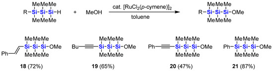 As mentioned above, we have reported ruthenium-catalyzed dehydrogenative alkoxylation of a hydrodisilane with alcohols without Si–Si bond cleavage [44]. The reactions are also applicable to various hydrotrisilanes. As shown in Scheme 4, some of the hydrotrisilanes synthesized above were subjected to the ruthenium-catalyzed dehydrogenative alkoxylation with methanol. All reactions proceeded smoothly in toluene at room temperature in the presence of 2.5 mol % of [RuCl2(p-cymene)]2 to afford methoxytrisilanes 18–21 in good yields. It is worth noting that the alkenyl and alkynyl moieties tolerate the reactions. Neither hydrosilylation nor bis-silylation occurred under these reaction conditions.