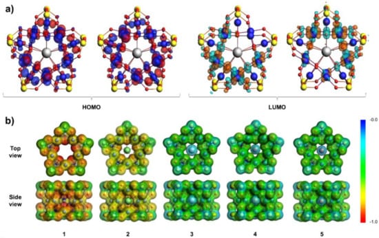 (a) The doubly degenerate highest occupied molecular orbital (HOMO) and the lowest unoccupied molecular orbital (LUMO) of 1-La which is also representative for 1-Gd and 1-Lu; (b) molecular electrostatic potential plotted over the density isosurface of polyanions 1–5. The most negative potentials are colored in red. All calculations are performed at (U)B3LYP/TZ2P/ZSC/COSMO-water level. Color code: Se = yellow, Pd = blue, O = red, and Ln = grey spheres.