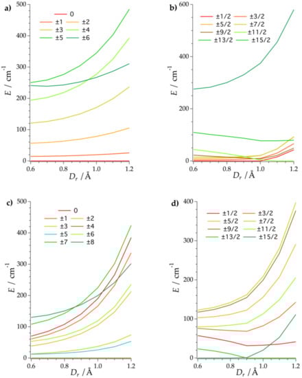 Starting from the DFT-relaxed structure of the 1-Gd, we have applied the Radial Effective Charge (REC) model [37] using the SIMPRE computational package [38] to the 1-Tb, 1-Dy, 1-Ho, and 1-Er derivatives. This parametric model introduces covalency effects by placing an effective charge at an effective distance determined by a radial displacement Dr (see Section Five of Supplementary Materials for details). One of its main advantages is that, for similar families of homoleptic coordination complexes, such parameters are reusable, allowing an inexpensive determination of the spectroscopic and magnetic properties [39]. Thus, we have taken advantage of the semi-empirical information of the recently reported [LnPd12(AsPh)8O32]5− series [20] to provide an estimation of the ligand field splitting of the ground-J multiple as well as the ground state composition of each derivative. As the coordination number in these two families of POPds is different, 8 in the case of [LnPd12(AsPh)8O32]5− and 10 in [LnPd15Se10O40]7− and we do not have access to the X-ray structures, we have explored different possibilities for the REC parameters, always keeping constant the total f = Dr·Zi product [40]. The scanning of the REC parameters at different levels of covalency allows us to evaluate the robustness of the composition of the ground state with the aim of identifying which candidates are more suitable to exhibit single-molecule magnet (SMM) behavior. The resulting energy level pattern as a function of the value of the radial displacement for 1-Tb, 1-Dy, 1-Ho, and 1-Er is reported in Figure 3.