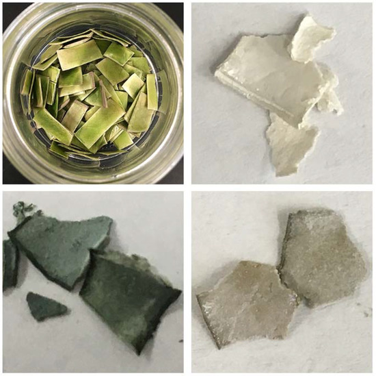 The ZZ leaves contain complex cellular and vascular structures that are largely intact after the room-temperature chemical dehydration in DMP [37]. This process is simpler than a multi-step alcohol dehydration process and does not require complex equipment as is used in supercritical or freeze-drying processes. The DMP reaction is equimolar with water leading to methanol and acetone as shown in Equation (1). In addition to DMP, the methanol and acetone dehydration products can also act to extract molecular species, including green chlorophyll from the plant cells.