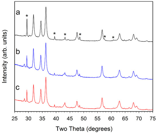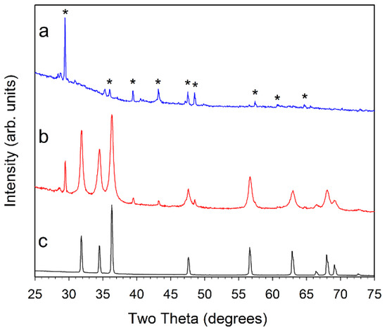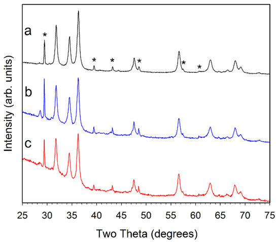 Powder XRD results for (a, black) 1% Ni–ZnO; (b, blue) 5% Ni–ZnO; and (c, red) 10% Ni–ZnO. The major peaks for CaCO3 are marked with a * symbol in (a). The small peak near 28.5° is consistent with KCl.