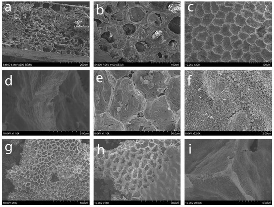 SEM images of (a,b) dehydrated ZZ leaf template; ZZ-ZnO (c) cellular view and (d) close-up wall view; Co(5%):ZnO (e) cellular view and (f) granular wall image; (g,h) Ni(10%):ZnO cellular view; and (i) Ni(5%):ZnO close-up view of cell wall intersection point.